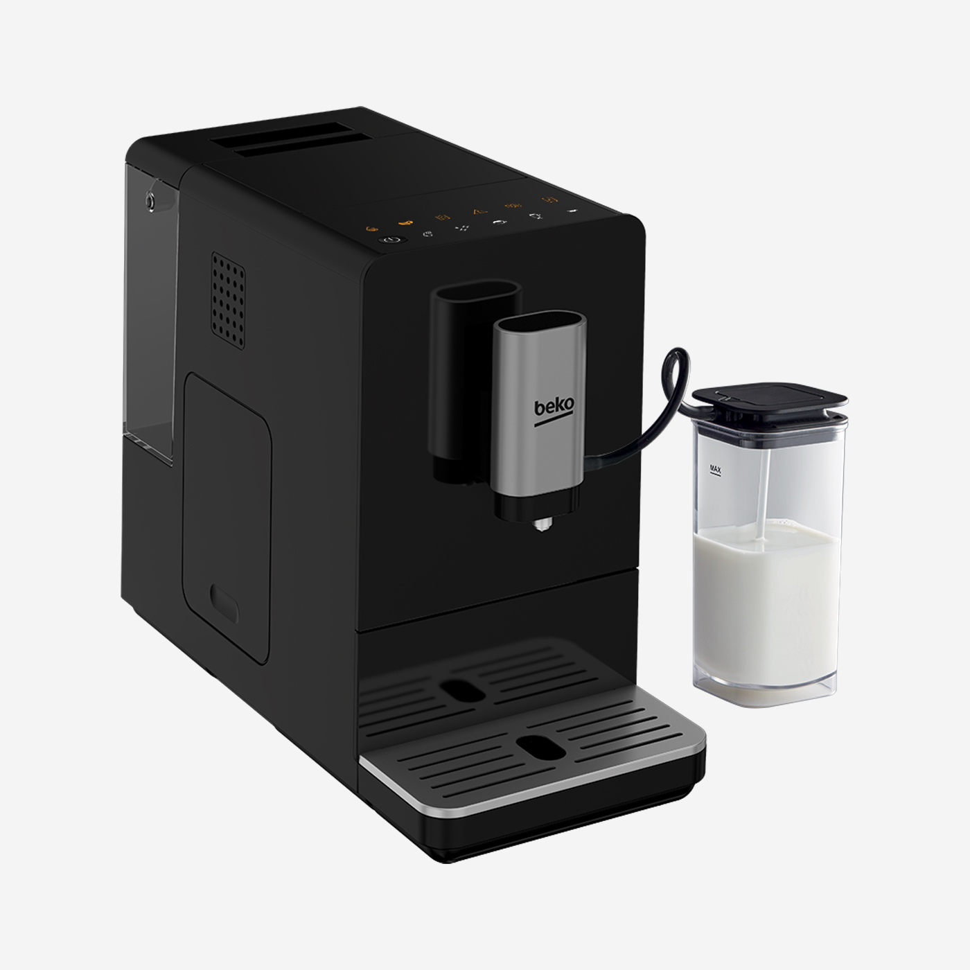 Fully automatic espresso machine with integrated grinder & milk cup – 1350 Watt – 19 Bar Pump Pressure – Height-adjustable coffee dispenser – Pre-brew function – Eco mode & Auto shut off function