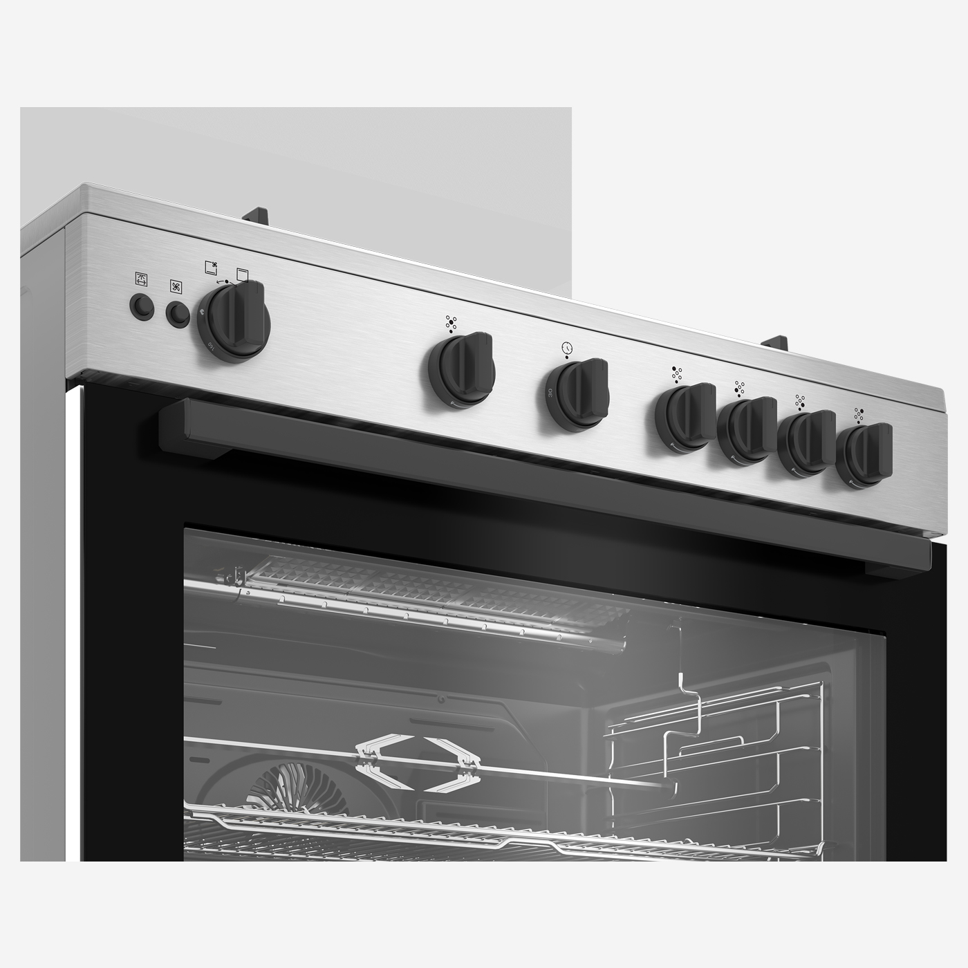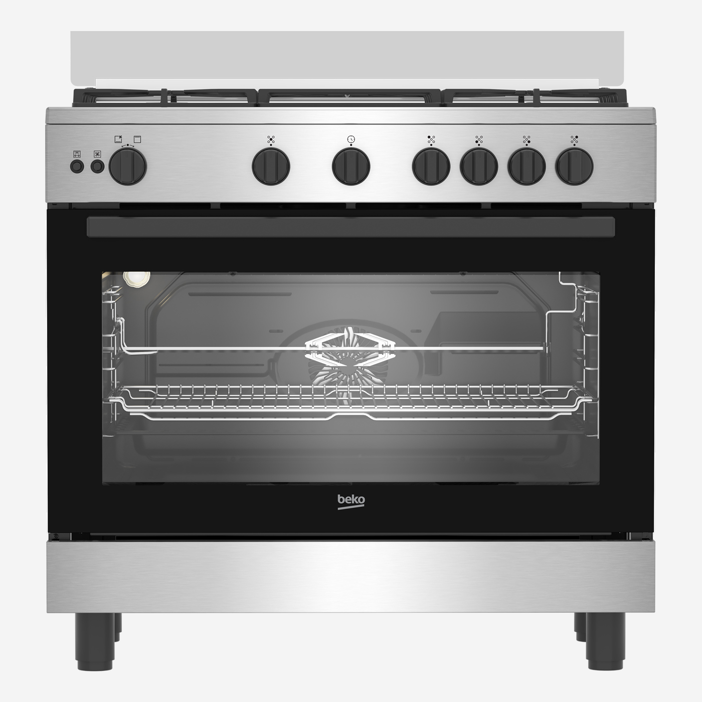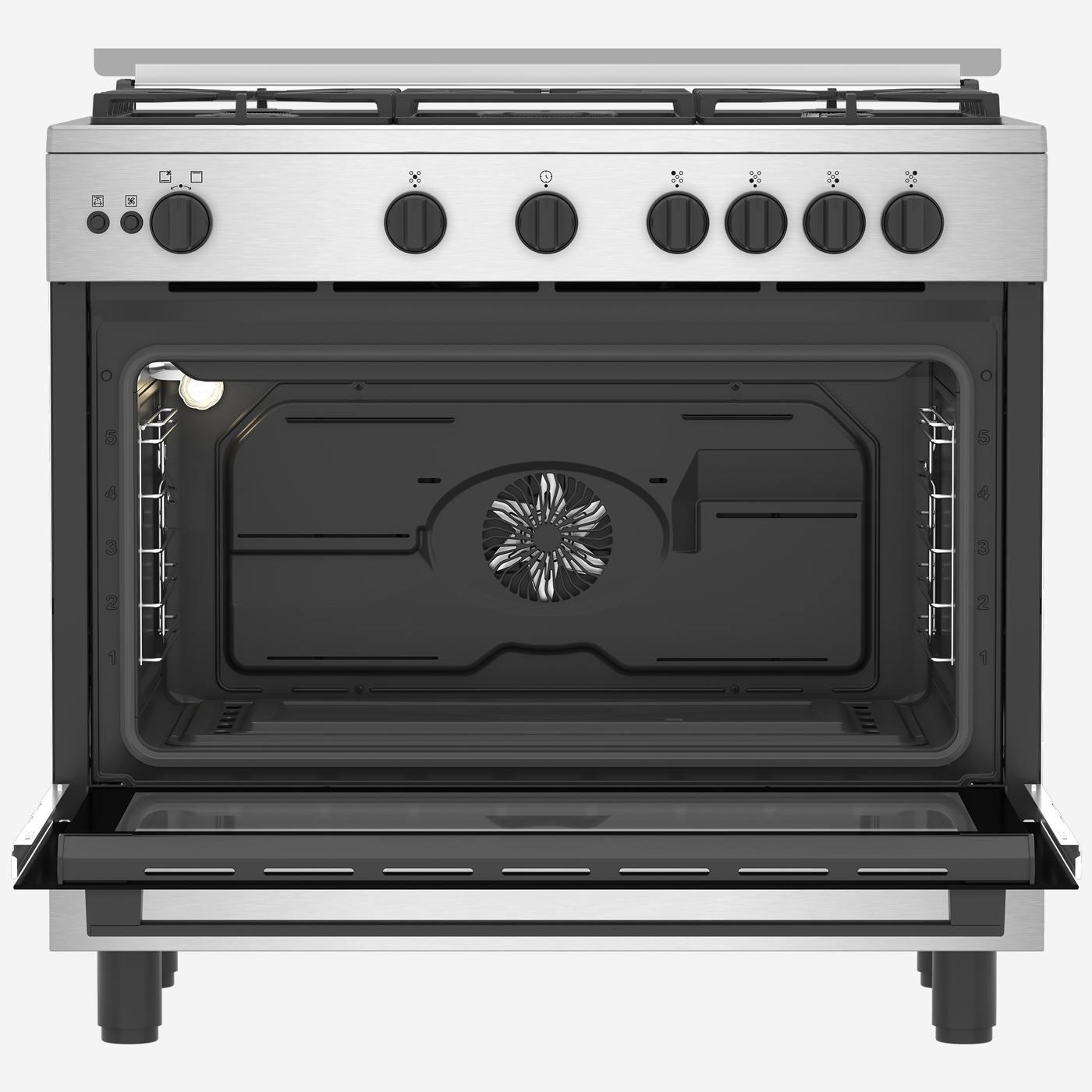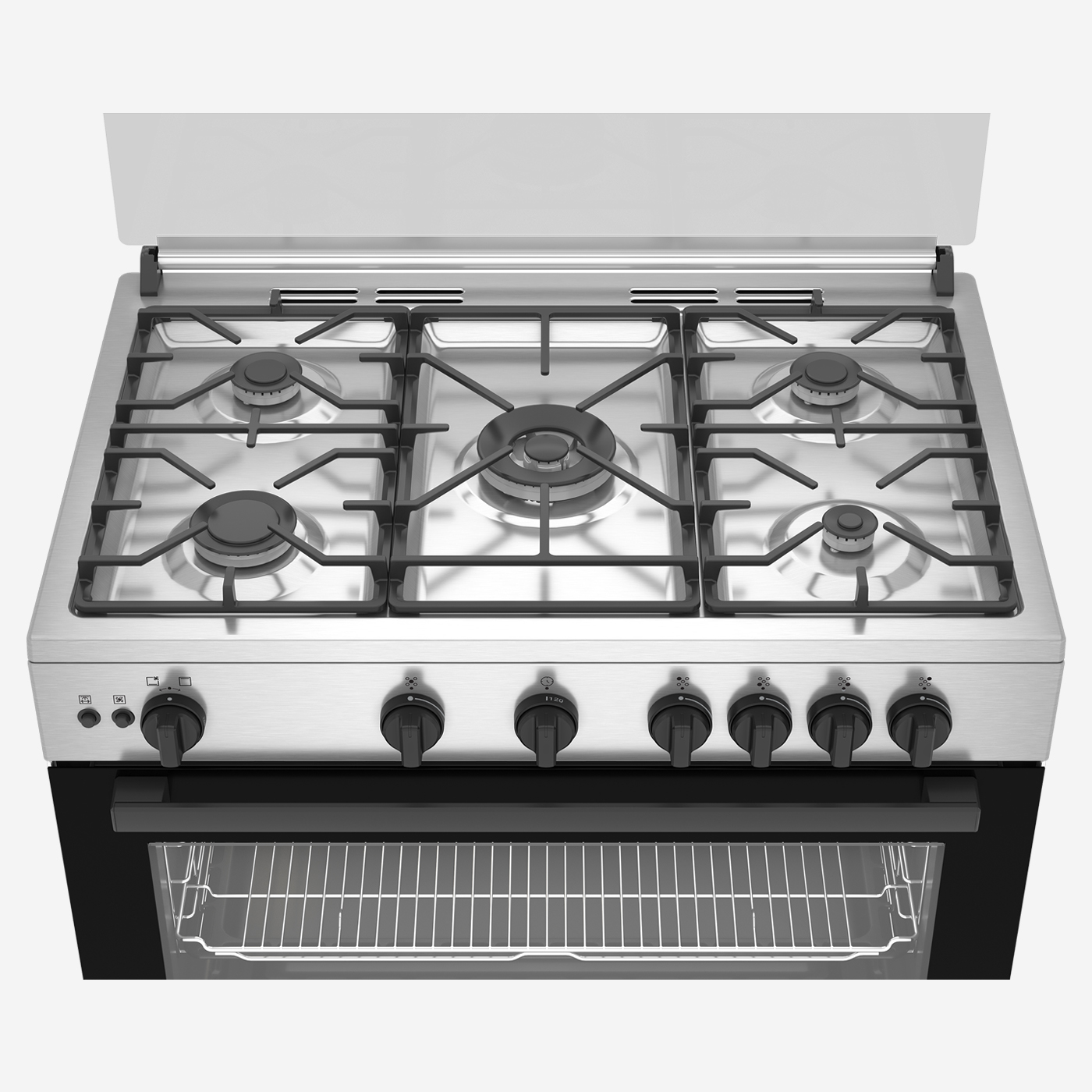 موقد غاز 90 سم، 5 شعلات، مزود بمروحة تبريد آمنة بالكامل، ومروحة طهي، ودعامة أواني من الحديد الزهر، وفولاذ مقاوم للصدأ