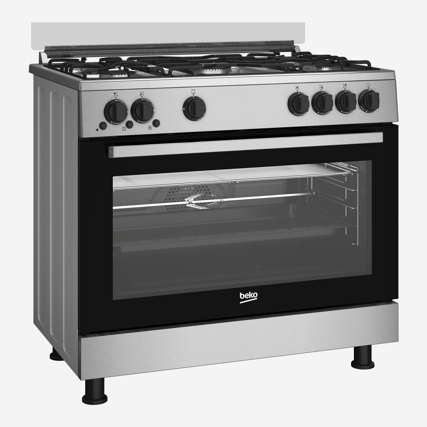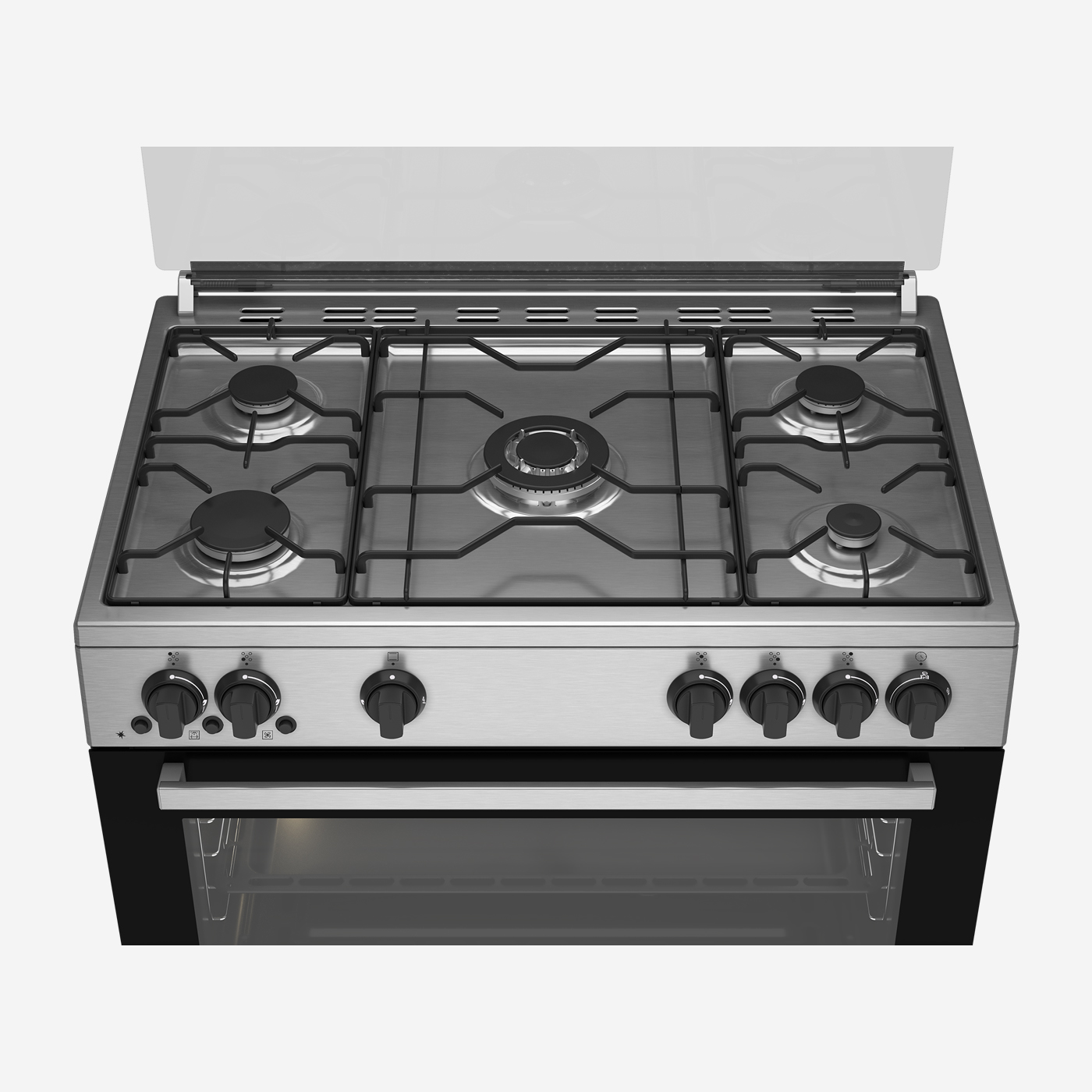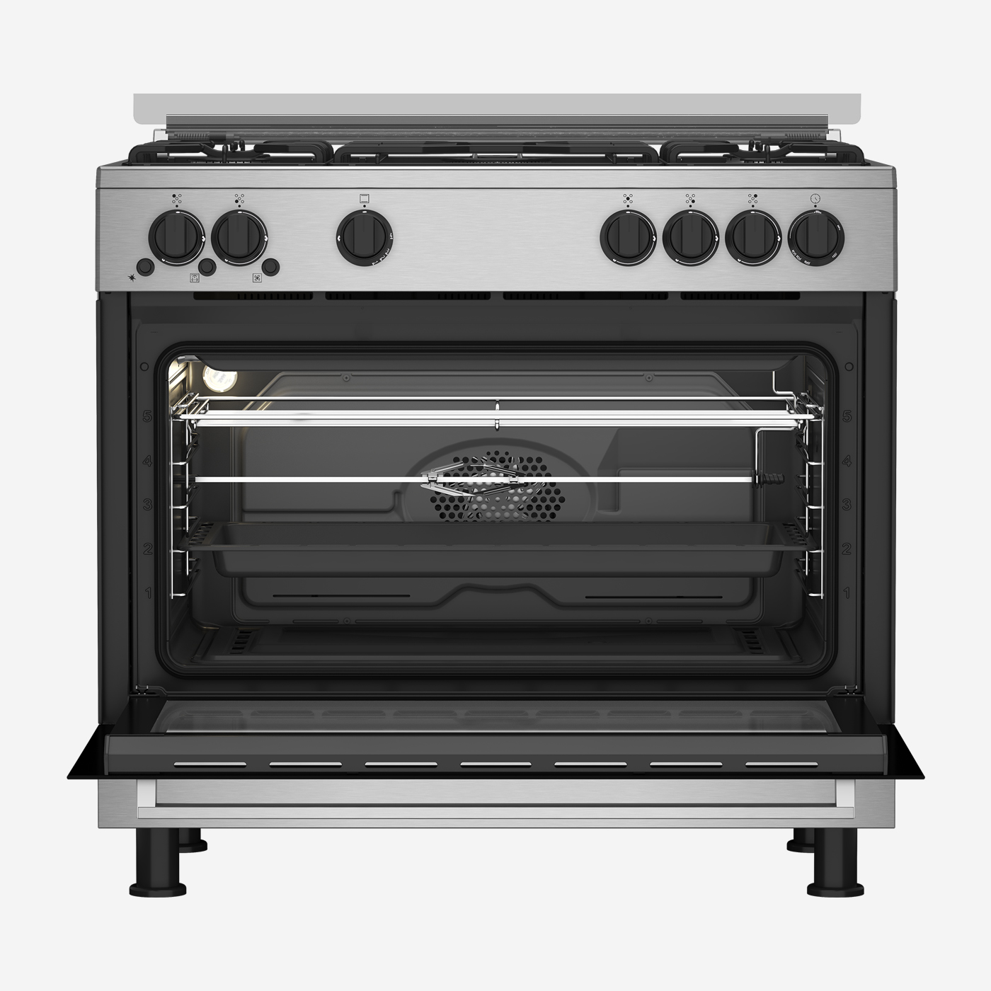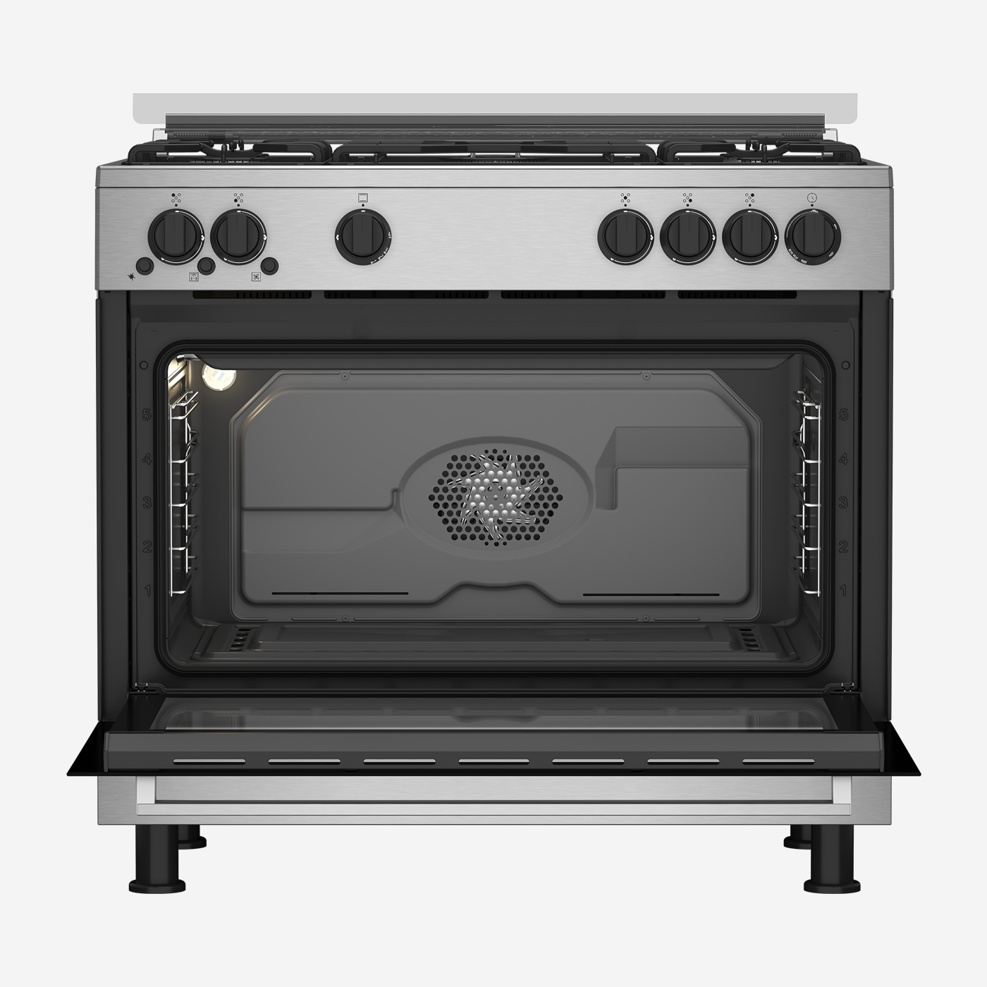 موقد غاز 90 سم، 5 شعلات، مزود بمروحة تبريد أمان كاملة، ومروحة طهي، ودعامة أواني مطلية بالمينا