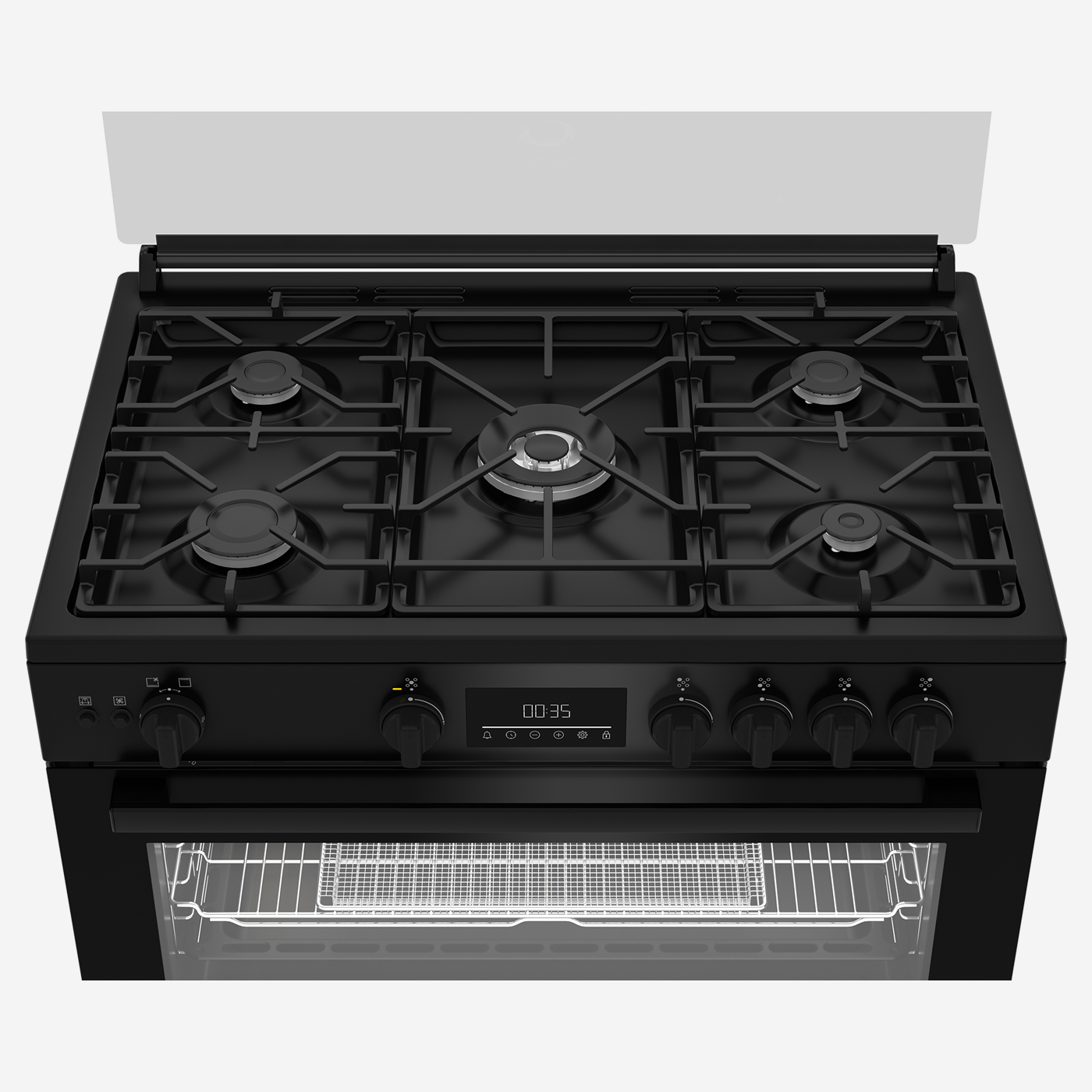 موقد غاز 90 سم، 5 شعلات، مزود بنظام أمان كامل، مروحة تبريد، مروحة طهي، شاشة LED تعمل باللمس، حامل أواني من الحديد الزهر، أسود
