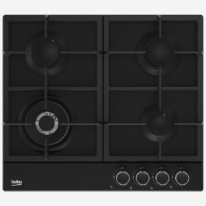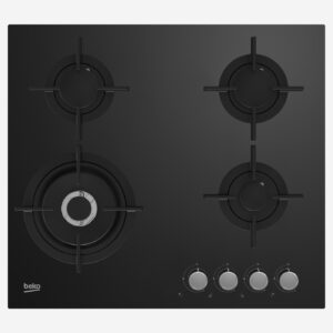 Gas Hob 60 cm 4 Berners, Gas Safety, Cast Iron Pan Support, Black Glass, Integrated Ignition
